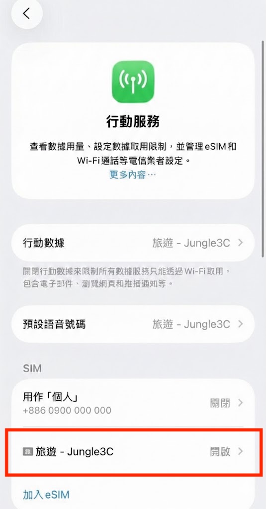 • 於「行動服務」> 「選擇旅遊eSIM的門號」