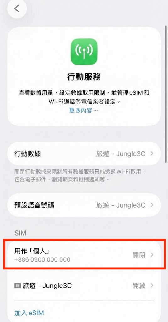 • 點選最上方的 「行動數據」,切換至您的 eSIM 線路