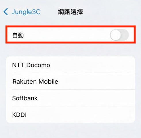 • 關閉「自動」稍待幾分鐘,會顯示搜尋到的電信基地台,並選擇購買eSIM相應的電信基地台(如日本IIJ原生卡選擇NTT Docomo、日本5G選擇KDDI、5G雙電信可選擇KDDI或SoftBank)